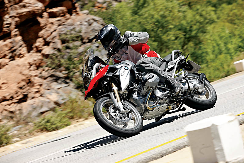 Handling was familiar GS: stable, reliable, and responsive enough to encourage a decent pace. At 238 kg ready to ride this GS is nine kilos heavier than the previous model, which explained why nobody at BMW was talking about weight (let alone displaying large water containers to highlight the difference, as they did in 2004). But the light-heavyweight boxer felt good enough to match its sparring partners for road-going handling, unless you include the more road-biased Multistrada.
