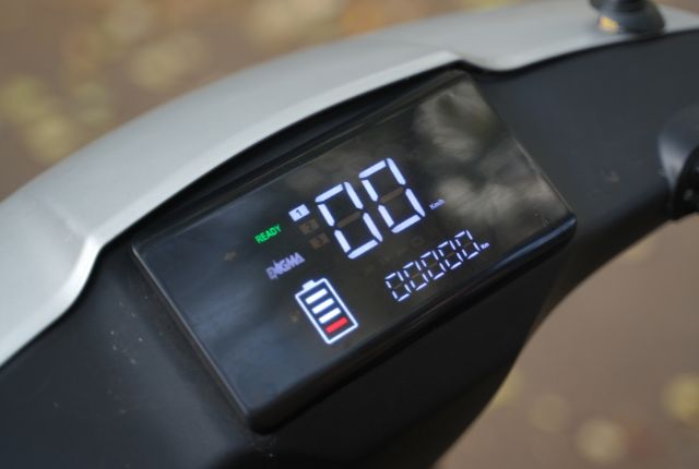 The digital dash shows the bare minimum information. There is no connectivity feature. The digital dash has a speedometer, an odometer which disappears after 10 seconds, a tripmeter which resets every time the scooter is rebooted, and a battery indicator in bars (not percentage or range in kilometres). The battery bars swing wildly between one and four depending on acceleration or deceleration, making range estimation nearly impossible. The only place where we can see the battery percentage is the charging adapter when plugged for charging.