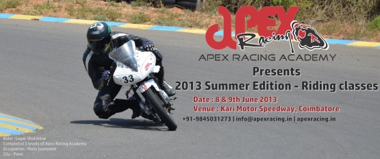 The second round of Apex Racing Academy’s 2013 Summer Edition- Riding Classes will be held at the Kari Motor Speedway On 8th and 9th June 2013. Apex Racing’s coaching programme includes both theory and practical lessons where the participants are attended by dedicated trainers. The riding school is ideal for those who wish to learn or improve their riding skills on a racetrack but these folk also let you go round and round on the race-track even if you are not a part of the riding course, at a fee of course.