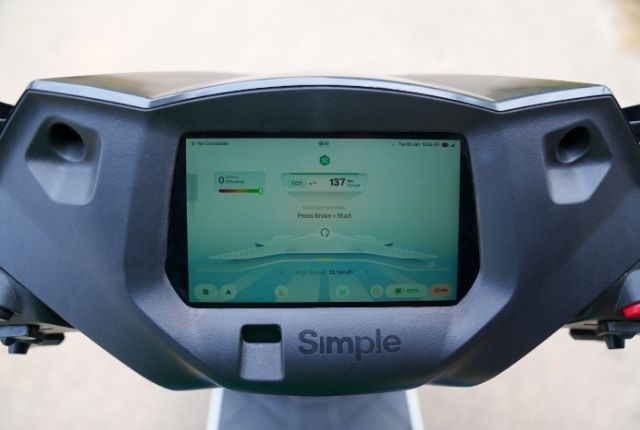 The Simple features a seven-inch touchscreen, referred to as the Human Machine Interface (HMI), running on the Simple OS. It offers functions such as navigation, music control, notifications, and call alerts, among others. While the interface is feature-rich, the touchscreen response is slightly sluggish and the display could have been brighter, something that may improve with future updates. Navigation, in particular, struggles to keep up when the scooter is ridden at higher speeds.