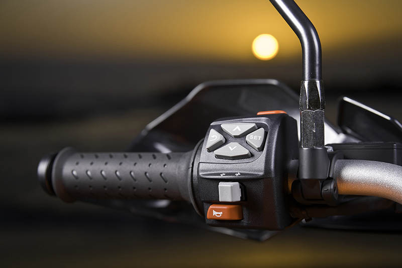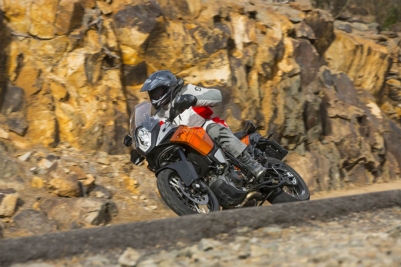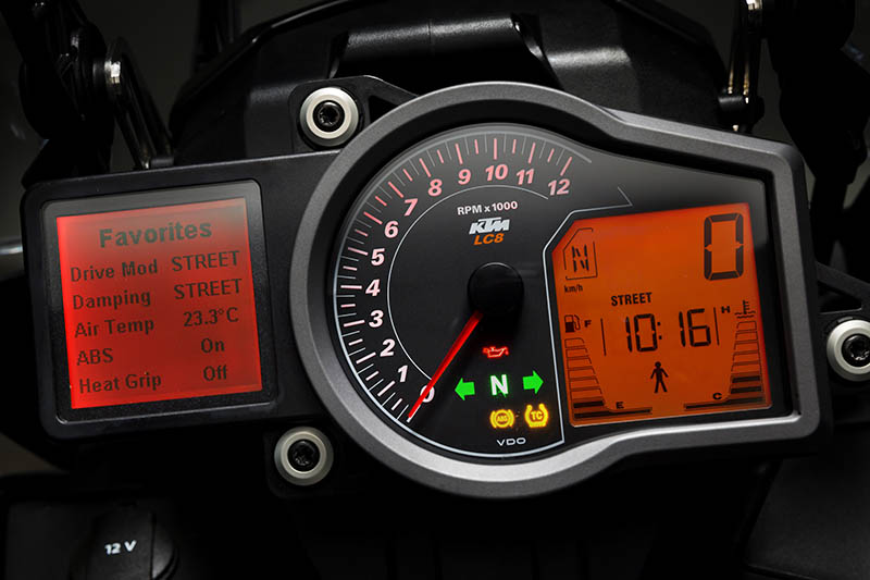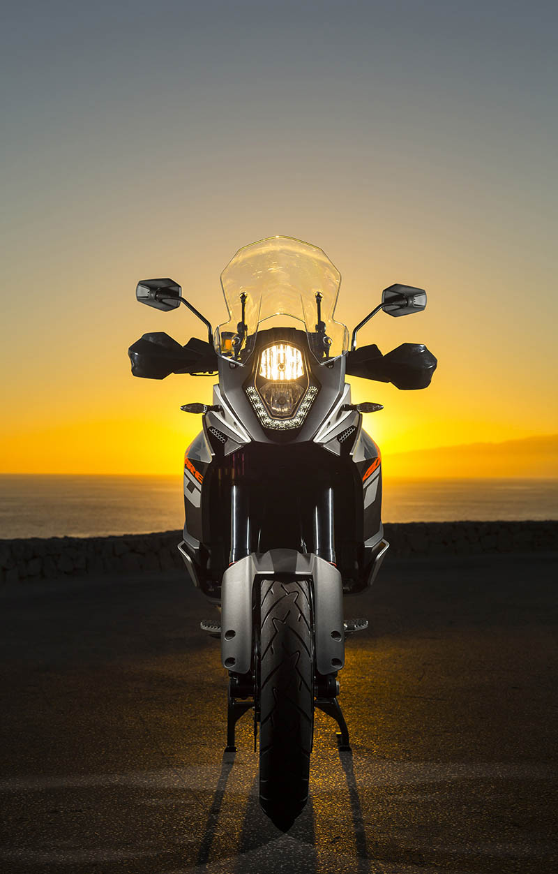 The sharp-nosed new bike is reminiscent of the old Adventure in its traditional orange or grey finish, differing most obviously in its two-piece seat and a slightly larger screen that is adjustable for both height and angle. The adjustable seat’s lower, 860-mm setting will be a bit high for short riders, but at least the KTM is lean. At a claimed 230 kg fully fuelled it’s comparable with the Multistrada 1200 and felt notably lighter than the other bikes in this class at a standstill as I selected the ‘Street’ mode by pressing the buttons on the left bar.