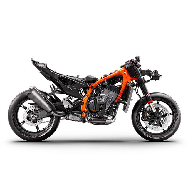 Braking performance comes from top-tier Brembo hardware, with four-piston HyPure calipers gripping 320 mm front discs and a 240 mm rear rotor. The 17-inch cast-aluminum wheels, borrowed from the 1390 Super Duke R, come wrapped in Michelin Power Cup 2 tires. Sans fuel, the whole package tips the scales at 184 kg.