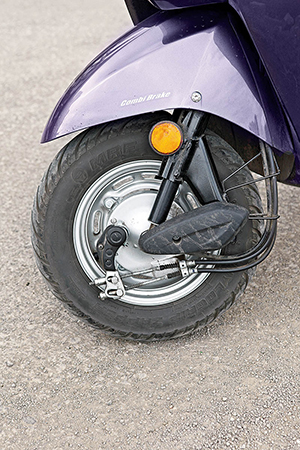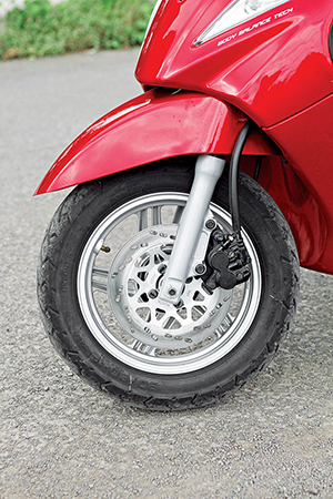 The Wego is followed by the Activa i, which has combi-brakes (front and rear brake are applied simultaneously via the rear brake lever) and tubeless tyres. It also has the best under-seat storage capacity and a brake locking mechanism for the rear brake lever.