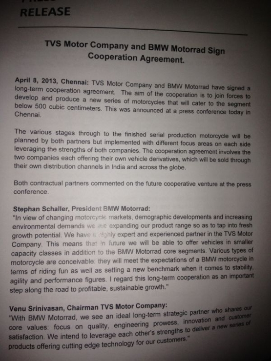 In what is one of the most notable alliances, TVS Motor Company has signed a cooperation agreement with German automotive giant BMW. TVS and BMW Motorrad will join forces to develop and produce a series of motorcycles which will have displacements under 500-cc.