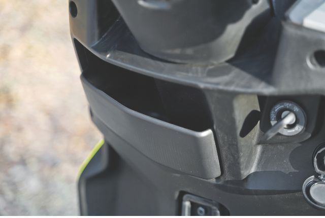 Glance further down, and the opening to the apron-mounted cubbyhole may seem unintuitive to use. But if you’re finding it difficult to take out your mobile, won’t it be the same for a potential thief? Or for the mobile itself, if you go over a bump? So take a bow, TVS. Er, wait; the USB port on the handlebar stalk means your mobile is both accessible and can be replenished on the move. Yes, detractors may say the cubbyhole’s hard plastic could damage their prized possession, and prefer to keep it in their bag. For them, TVS has equipped the apron with a tough-looking hook that snaps shut when you secure your bag on the floorboard. Ok, TVS, now you can take that bow!