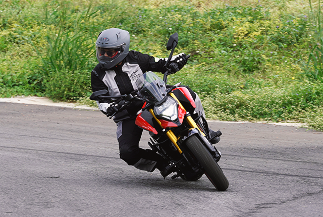 One of the biggest talking points with the X47 is its debut of radar-based rider alerts, offered as standard across all variants. At its core sits a rear-facing radar module, constantly sweeping 200 metres of road behind. It acts as an unseen guardian, flagging blind spots, warning of vehicles rushing past, or even signalling an imminent collision. The alerts appear as subtle lights in the mirrors, backed up by messages on the TFT display. Unlike car systems, this one doesn’t intrude with steering or braking: it merely issues visual warnings, leaving control firmly in the rider’s hands. Though we couldn’t test it on public roads, the demonstration at that karting track showed it working seamlessly.